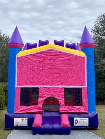 Make your next event a bouncy success with Rip Roaring Rentals' pink and purple bounce house!
